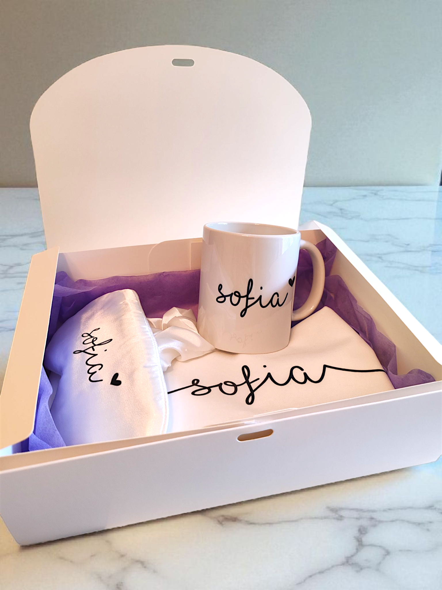Voit valita mukiin ja unimaskiin omat nimet, lyhyen tekstin (esim. Maailman parhaalle kaasolle) tai vaikka päivämäärän. Lisäksi voit päättää kampauksen, hiusvärin, asusteet ja aamutakin värin – lahja on siis täysin personoitu saajalleen.