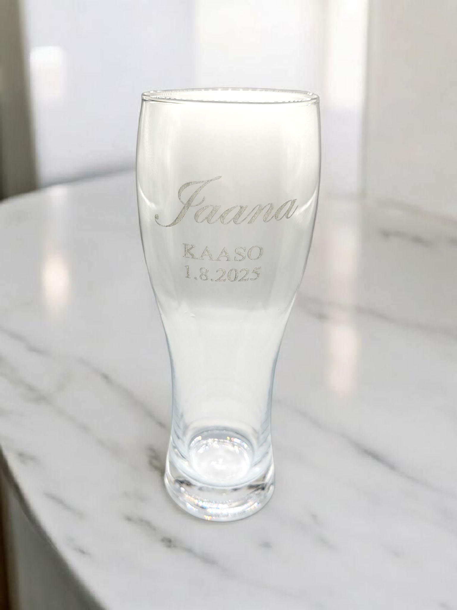 Tämä olutlasi kaiverruksella tekee jokaisesta hetkestä erityisen. Voit valita lasiin kaiverrettavaksi nimen, tekstin, päivämäärän tai vaikka roolin (Bestman, Ylioppilas, Isä, Ystävä).