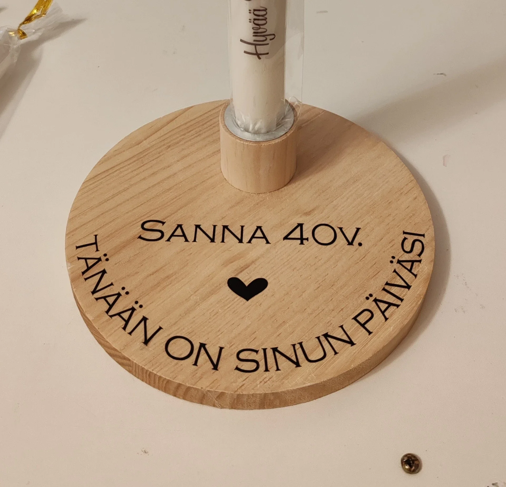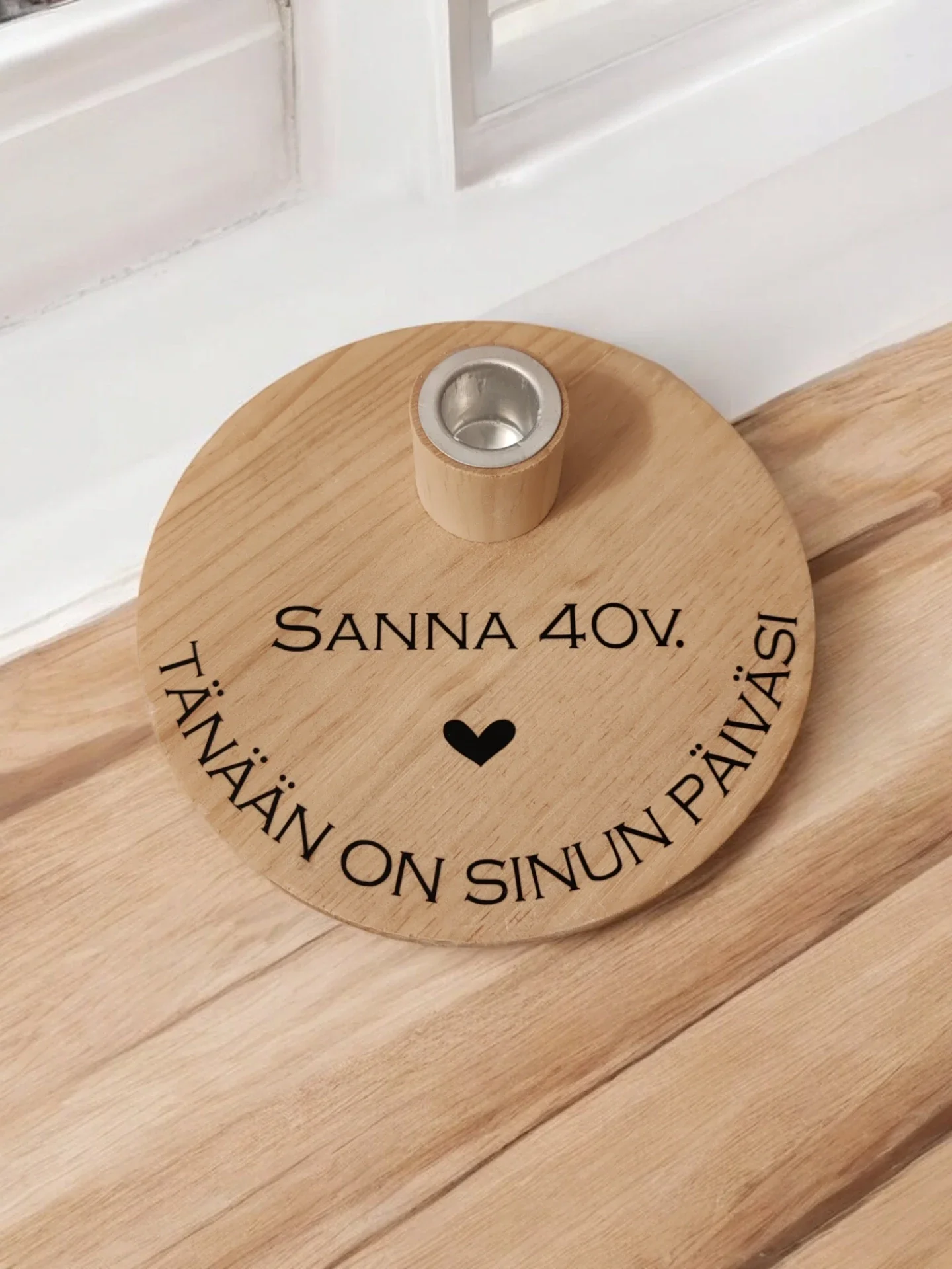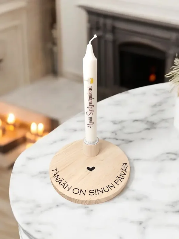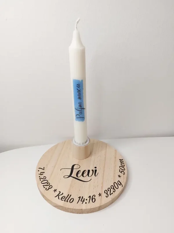 Syntymäpäivälahja ja Kynttilä - Henkilökohtainen Koti- ja Lahjaidea on kaunis ja käytännöllinen valinta kotiin tai lahjaksi. Tämä puusta valmistettu kynttiläpohja voidaan personoida esimerkiksi nimellä, päivämäärällä tai muulla tekstillä toiveidesi mukaan. Sopii erinomaisesti syntymäpäivälahjaksi, muistoksi tai sisustuselementiksi. Lapset, mummot ja kummit ilahtuvat varmasti! Valmistamme haluamasi määrän.