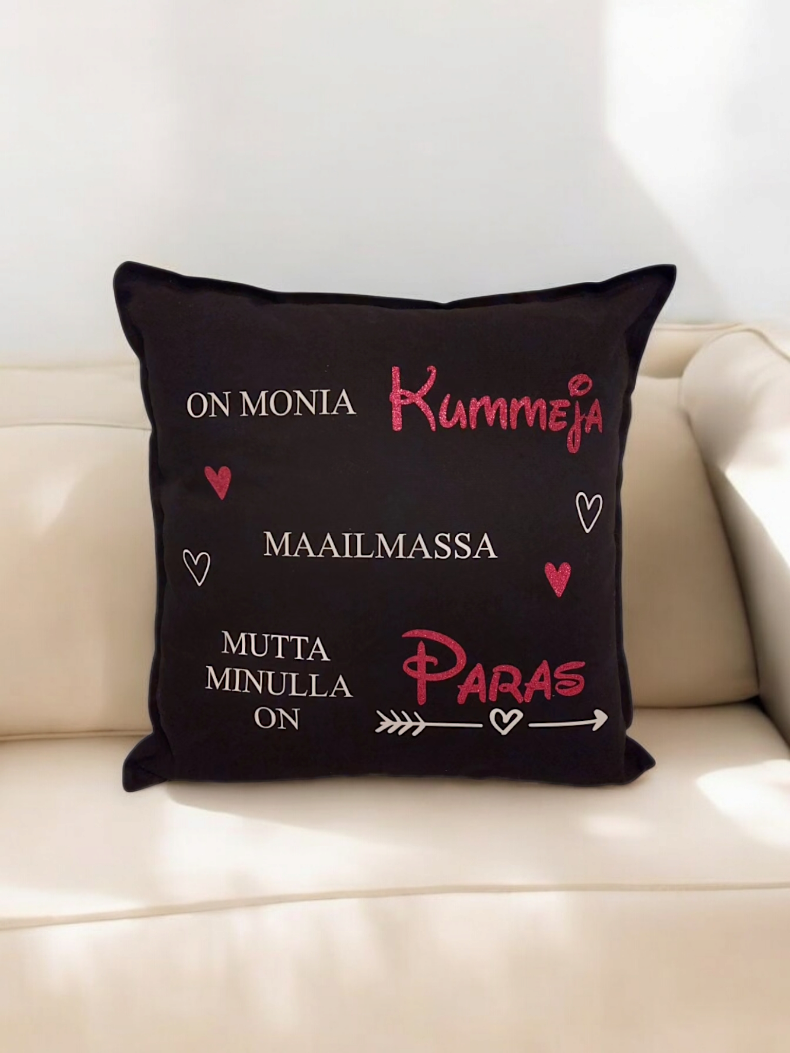 Tyyny Omalla Painatuksella - Personoitu Lahja Sisustukseen on ainutlaatuinen ja persoonallinen lahjaidea, joka ilahduttaa erityistä henkilöä. Tämä 50x50cm tyyny voidaan personoida omalla painatuksella, kuten nimellä, kuvalla tai muulla tekstillä. Sopii erinomaisesti sisustukseen tai lahjaksi esimerkiksi syntymäpäiville tai vuosipäiville.