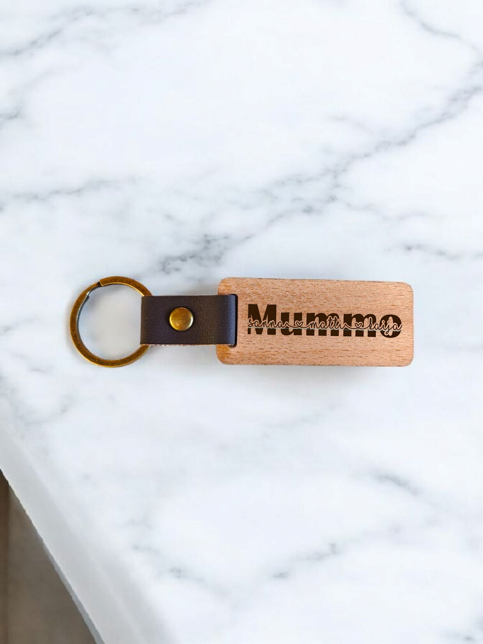 Puinen avaimenperä kaiverruksella – personoitu lahja