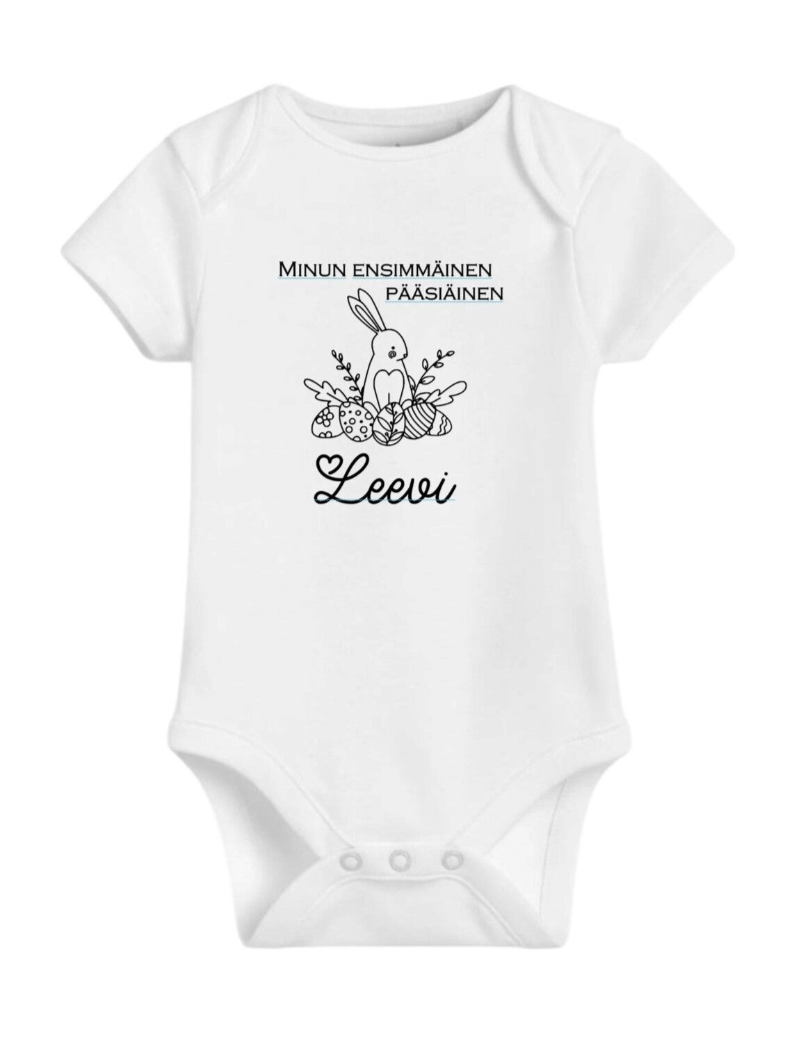 Vauvabody Ensimmäinen Pääsiäinen - Personoitu Lahja Vauvalle on ihastuttava ja käytännöllinen lahjaidea vastasyntyneelle. Bodyssä on vakioteksti "Ensimmäinen Pääsiäinen", ja siihen voidaan lisätä vauvan nimi tai oma teksti. Sopii erinomaisesti babyshower-lahjaksi, pääsiäislahjaksi tai yllätyslahjaksi tuleville isovanhemmille. Saatavilla pehmeästä ja mukavasta materiaalista, joka on suunniteltu vauvan herkälle iholle.