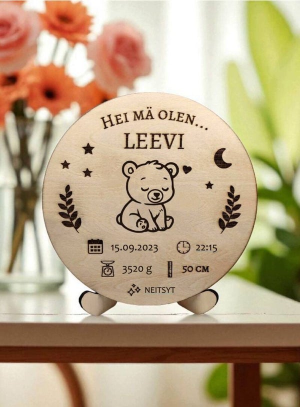 Puinen syntymätaulu lapsen tiedoilla. Voit asettaa pöydälle mukana tulevalla jalalla. Taulun halkaisija on 17 cm.
