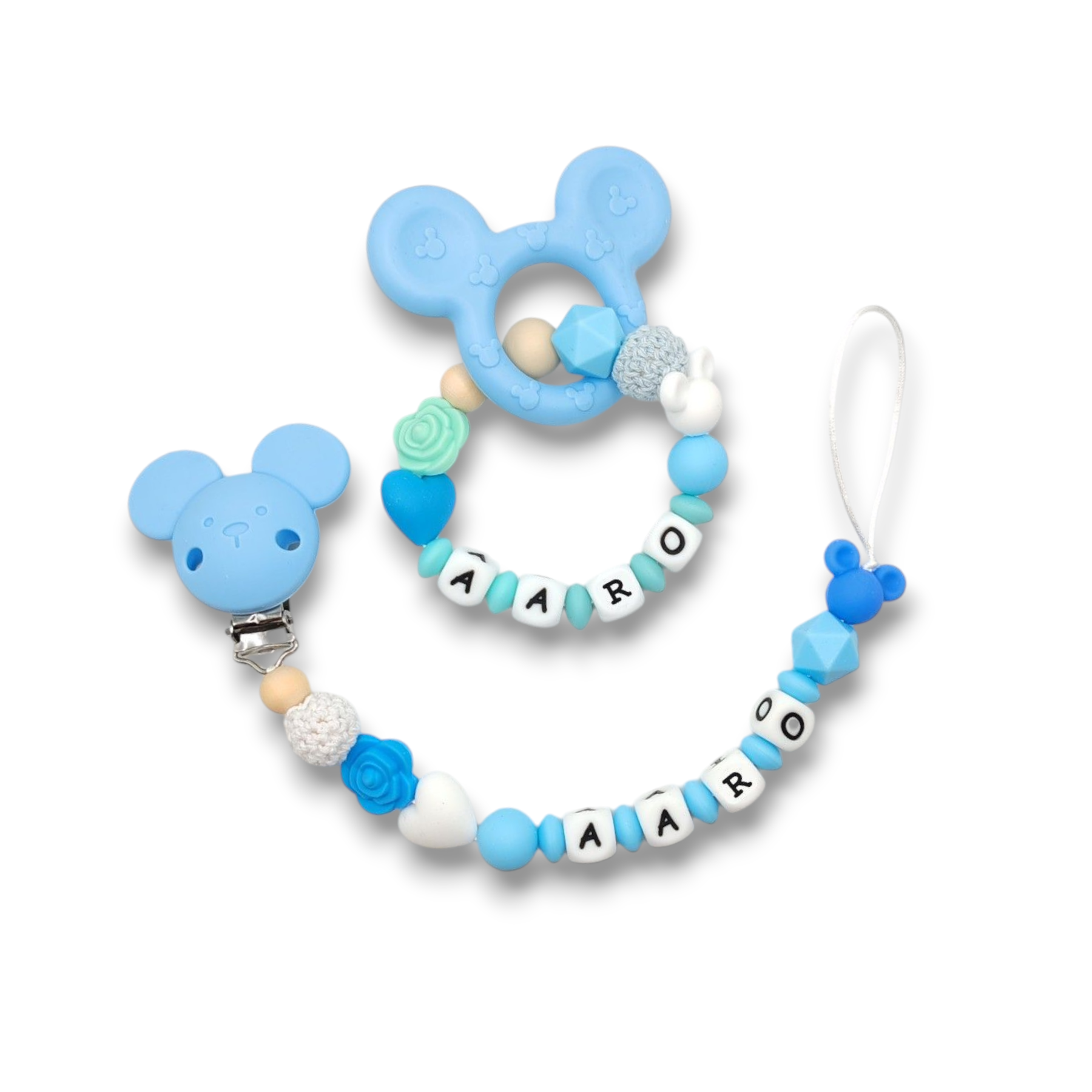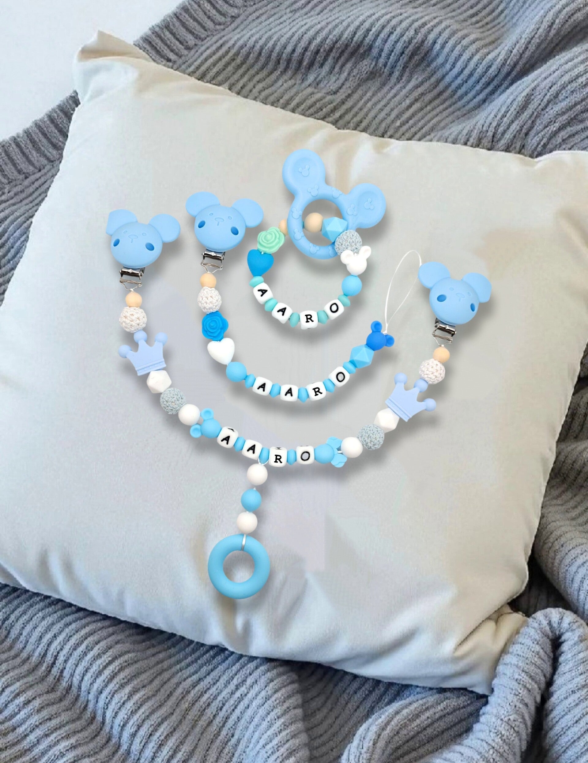 Tämä ihastuttava vauvasetti sisältää vaunulelun, tuttinauha ja pururenkaan, jotka kaikki voidaan personoida lapsen nimellä. Jokainen tuote valmistetaan käsityönä huolella ja tarkkuudella, asiakkaan toiveiden mukaisesti.