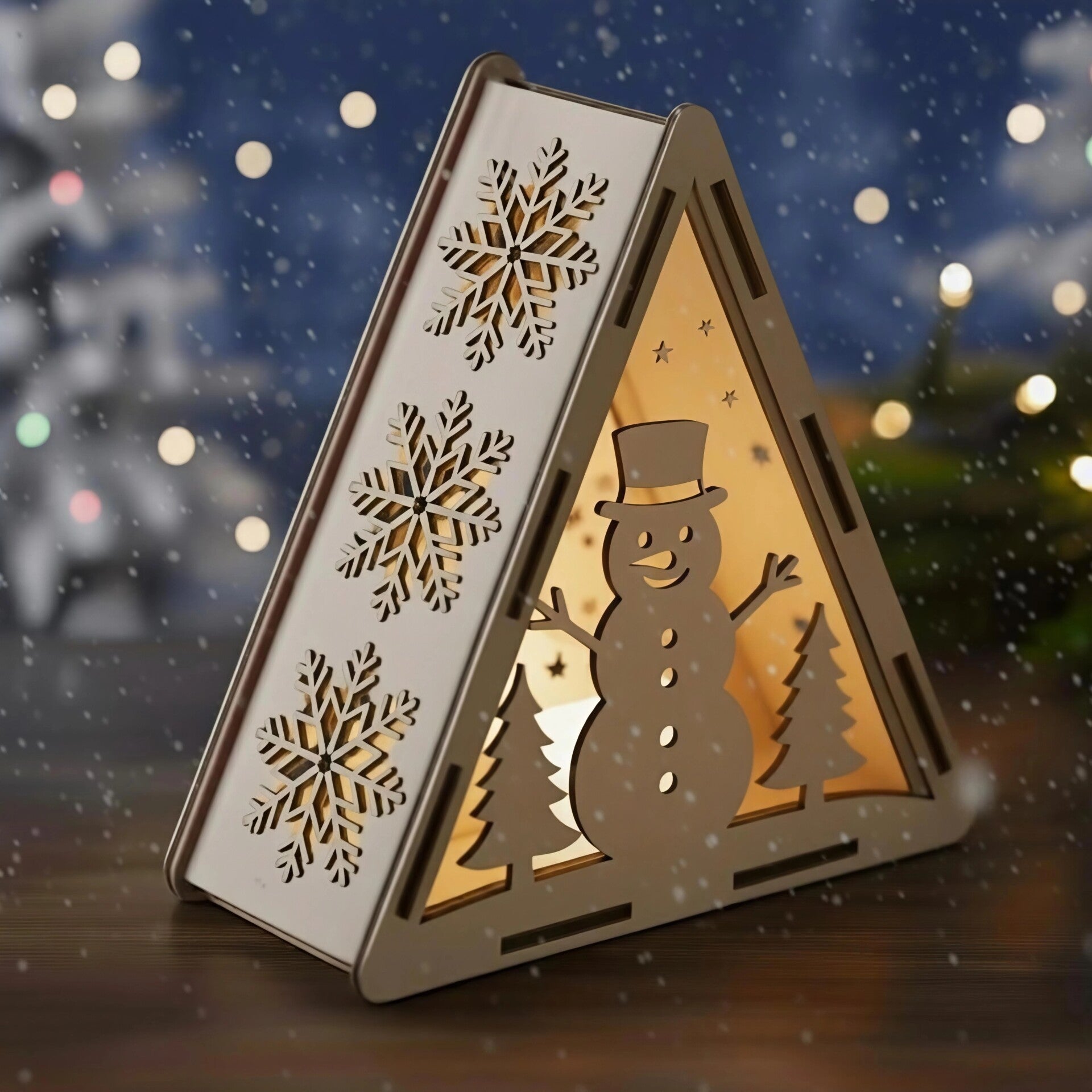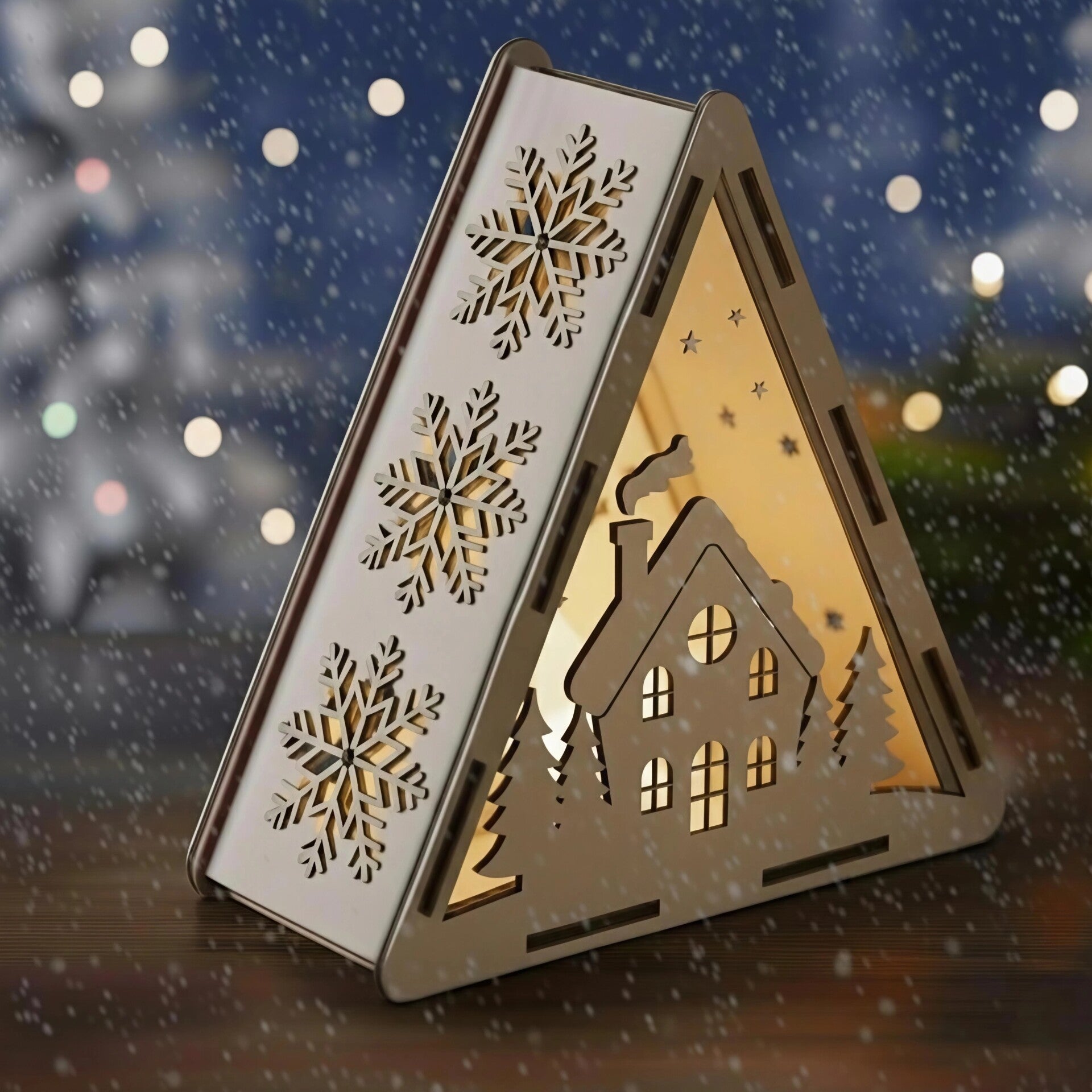 Tuo taianomainen jouluvalo kotiisi tällä kauniilla puisella kolmiolyhdyllä! Sisällä tunnelmallinen lämpimän valkoinen LED-valolanka, joka luo pehmeän hehkun lumihiutaleiden ja joulukuusien läpi. Pakkaukseen sisältyy paristo, joten lyhty on heti käyttövalmis. Täydellinen koriste ikkunalautalle, pöydälle tai hyllylle – luo rauhallinen joulutunnelma hetkessä. Laadukas laserleikattu puu tekee tästä kestävään joulukoristeen vuodesta toiseen.
